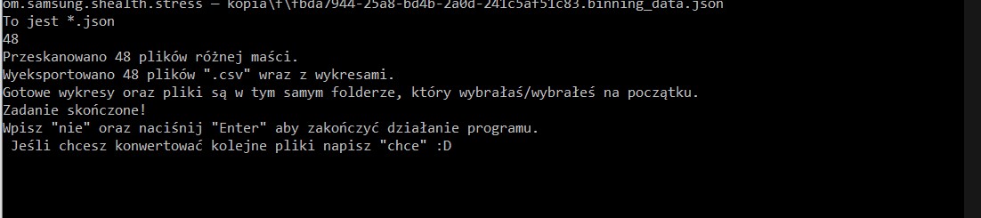 Program został napisany aby konwertować pliki typu .json do plików .csv. Program służy do analizy plików pobranych z opaski sportowej Samsung Fit dotyczących stresu. Pliki te wymagają specjalnej konwersji, której nie można było znaleźć w typowych programach w internecie. Program został napisany na potrzeby projektu PBL realizowanego na studiach dotyczącego opracowania stanowiska do analizy wypowiedzi publicznych.